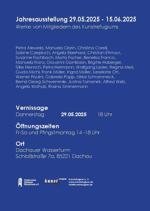 Ich freue mich zur Werkschau des Kunstrefugium, München, mit einigen Bildern beizutragen. Wir bespielen den Wasserturm in Dachau. Schloßstr. 7 a. Ein Juwel mit 4 Etagen - und vielen Stufen. Es lohnt sich, zu klettern.